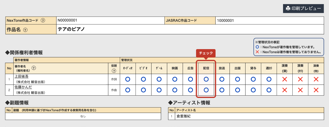 「◆関係権利者情報」について、「配信」の下の全てに「◯」がついていることを満たしていることを確認します