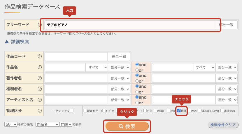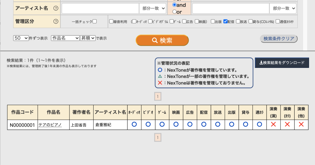 JASRAC の作品検索サービスで